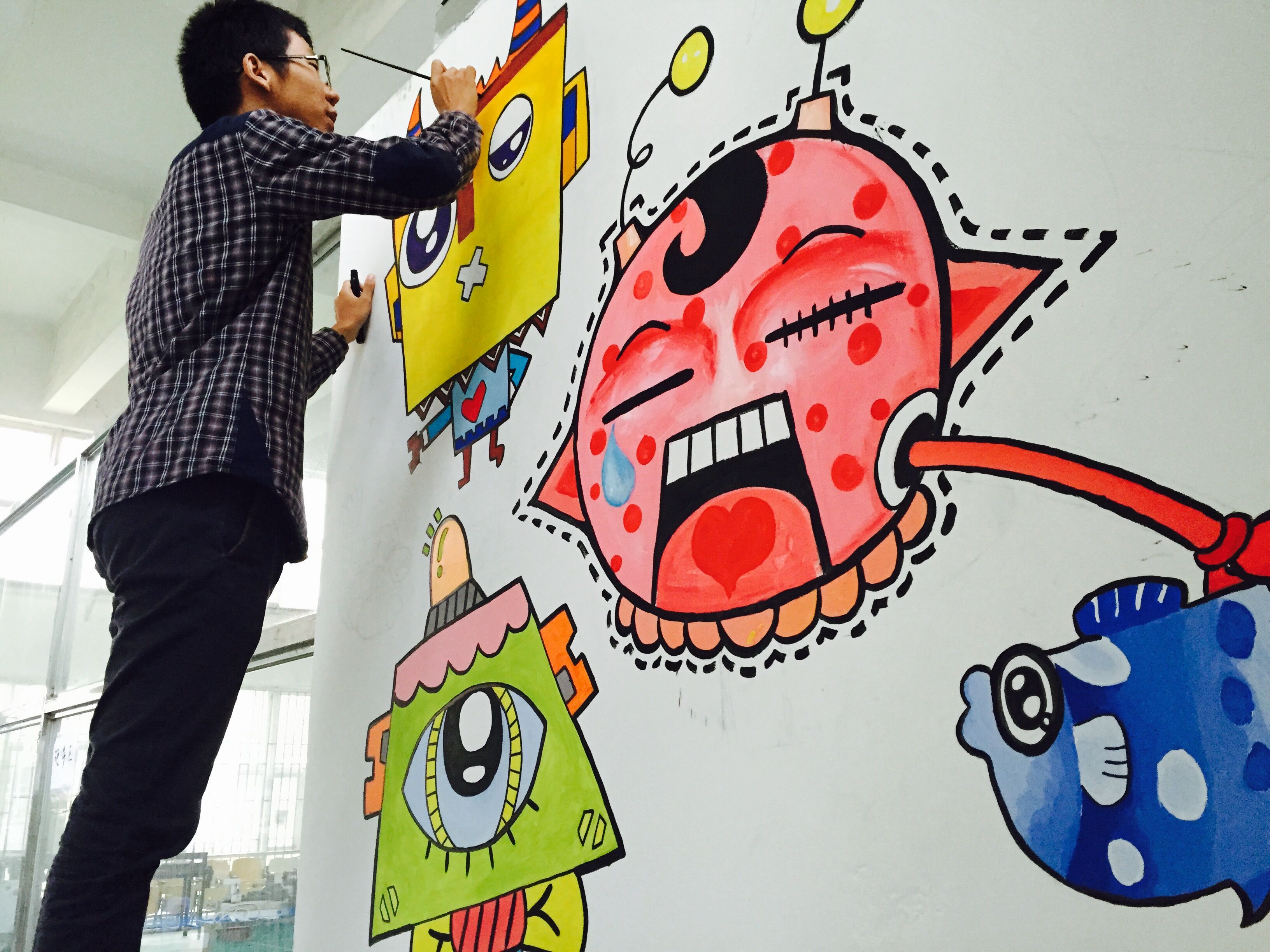 宣传部的成员们一有时间就待在实验室进行彩绘工作,他们在实验室里一边挥舞着手中的画笔,一边听着智能车和机器人运行的声音,从一开始的一片空白到墙体设计到初见轮廓再到最后的上色,这一系列的过程无不融入了十三水算法