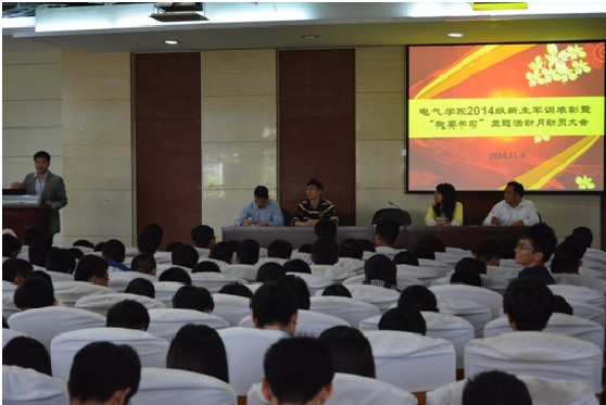 在会上,辅导员尹万东老师做军训工作总结报告。他对2014级新生军训的组织领导、制度安排、后勤保障、精神风貌、优良成绩以及存在不足进行了全面总结,为新生军训以后的学习安排做了详细布置。接着由军训优秀学员代表蔡斯婷同学发言,她深情回顾了半个月的军训对90后新生在时间观念、组织纪律、吃苦耐劳等方面的深切体会,明确表示了要在今后的基础知识学习、科技创新、社会工作方面继续发扬军训的优良传统和作风,以良好的精神风貌、勤勉的学习态度、务实的工作作风踏踏实实过好大学生活。