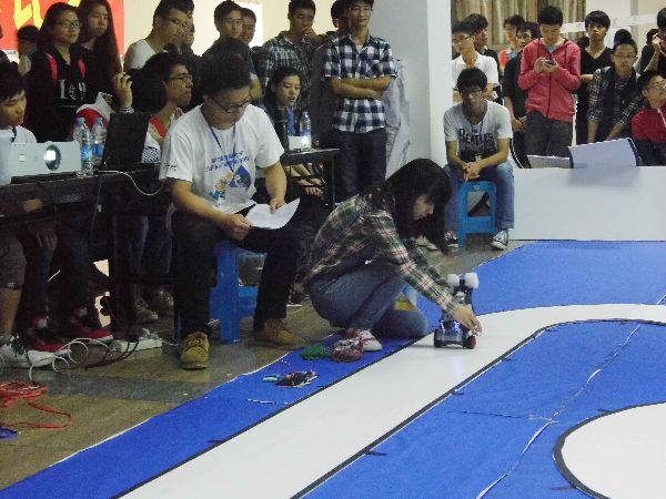 首先在比赛场上进行的是竞速赛初赛。初赛中选手按照规定让自己的“爱车”循着赛道跑上一圈,顺利跑完而不越出跑道即可晋级。在竞速赛中间还穿插了扣人心弦的技巧赛,观众们都为智能车的“聪明才智”折服而爆发出一阵阵热烈的掌声。最后是最具看点的决赛,这次将以车子跑完跑道的时间长短来决出胜负。于是各个选手都开足了智能车的马力,争先恐后想再创新“低”。现场的观众也随着记录的刷新而连连称赞,掌声络绎不绝。