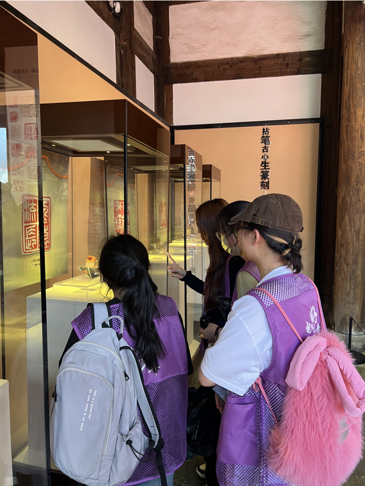 实践队首先参观的是篆刻艺术主题馆。篆刻艺术作为中华非遗文化的重要组成部分,不仅承载着中华民族的历史记忆和文化精神,也是链接过去与未来、传统与现代的桥梁。在篆刻艺术主题馆中,队员们观赏了各种精美的篆刻作品,了解了篆刻艺术的文化背景和艺术特点,篆刻艺术中体现的中华民族的智慧和创造力,令队员们感到自豪。