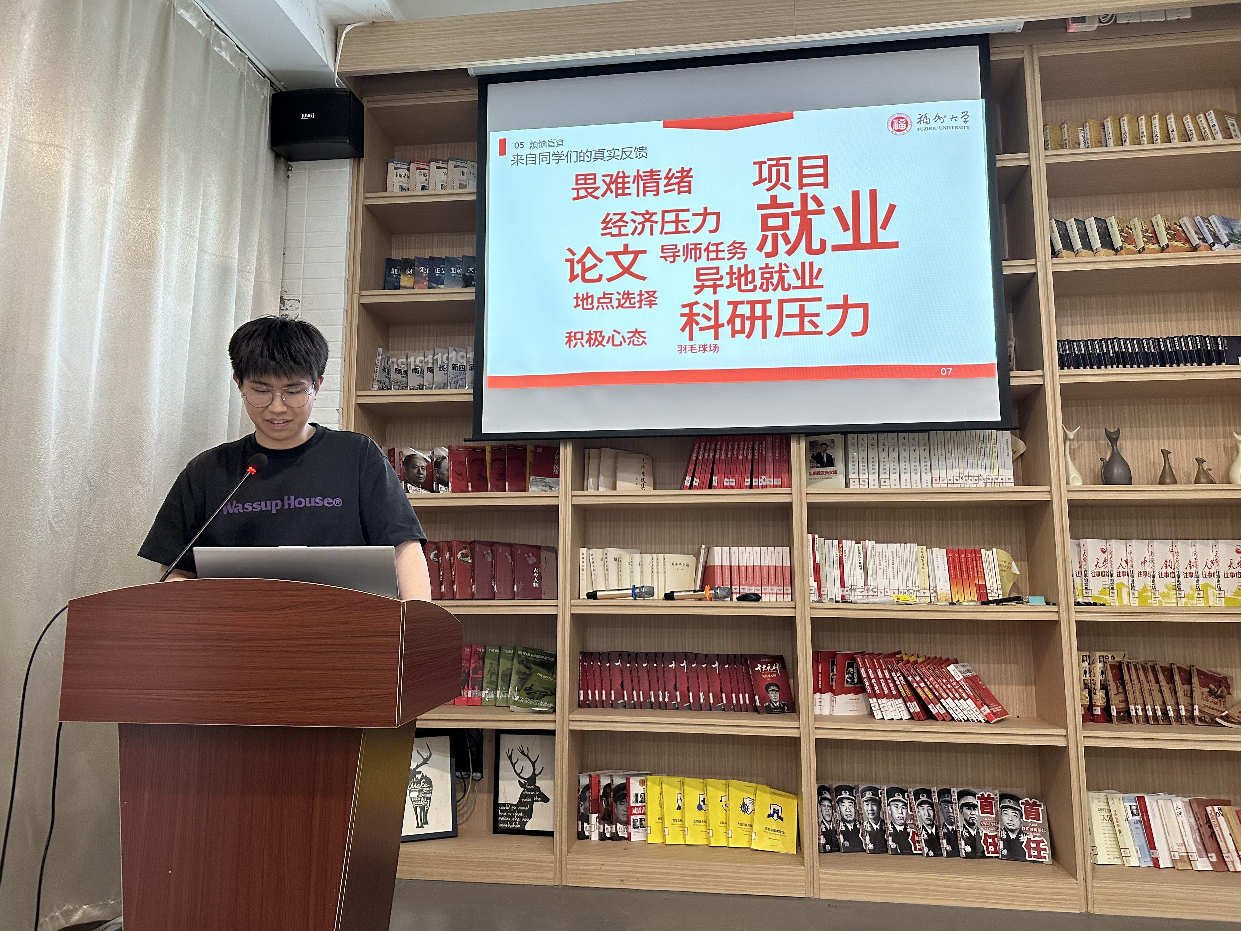 寝室是研究生的温暖家园,叶哲辉同学围绕“寝室里的那些矛盾”开展分享,同学们坦诚交流寝室相处中的作息、卫生、公共空间使用等困惑,在倾听中相互理解、换位思考。活动通过“烦恼盲盒”收集同学们的烦恼并提取典型词云,大家共同探讨压力与烦恼的化解方法,在尊重差异中凝聚共识,学会以正确方式解决问题、缓解压力。