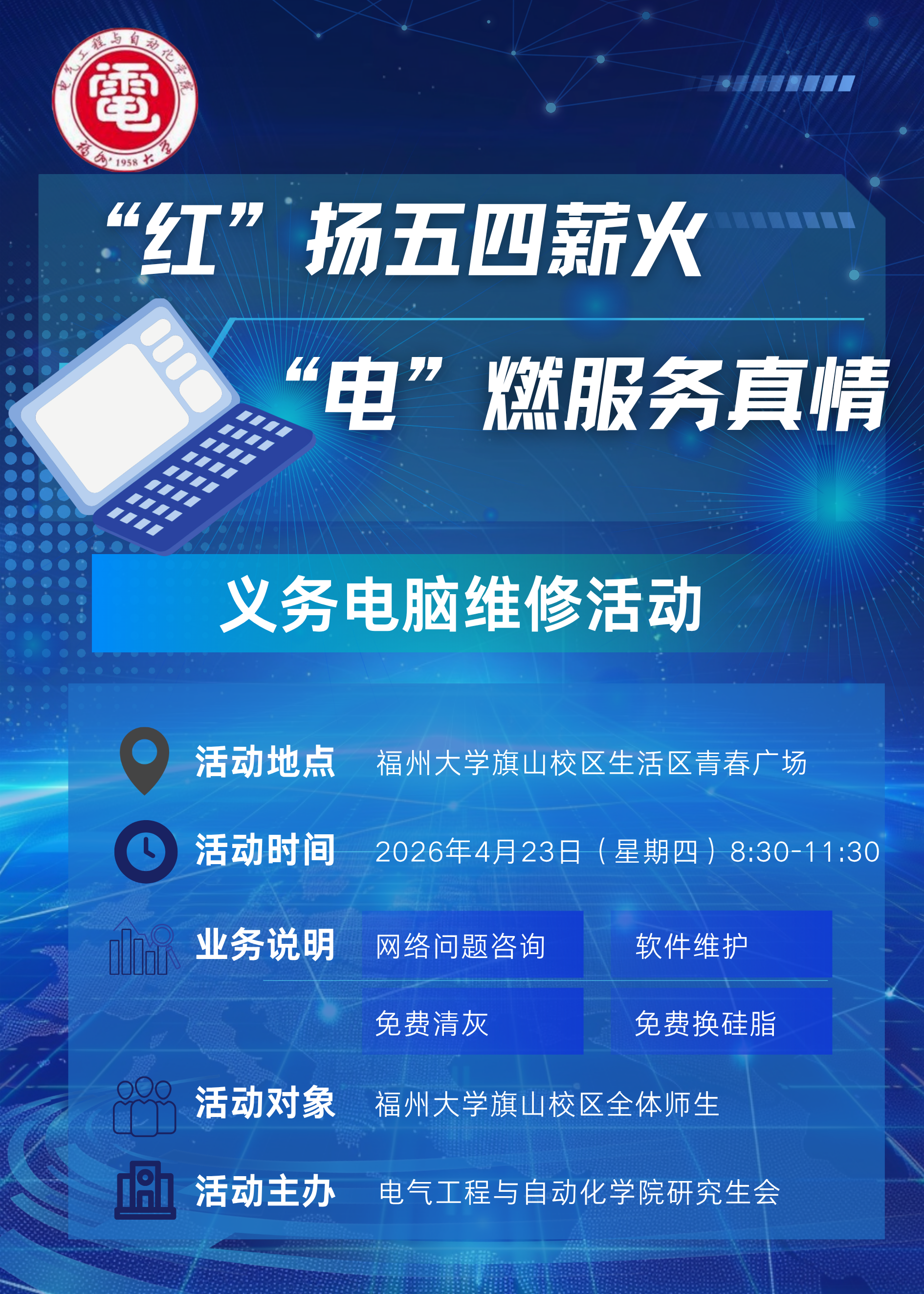 研究生会将于4月23日(星期四)上午8:30至11:30,在青春广场举办“红”扬五四薪火 ,“电”燃服务真情义务——义务电脑维修活动。
