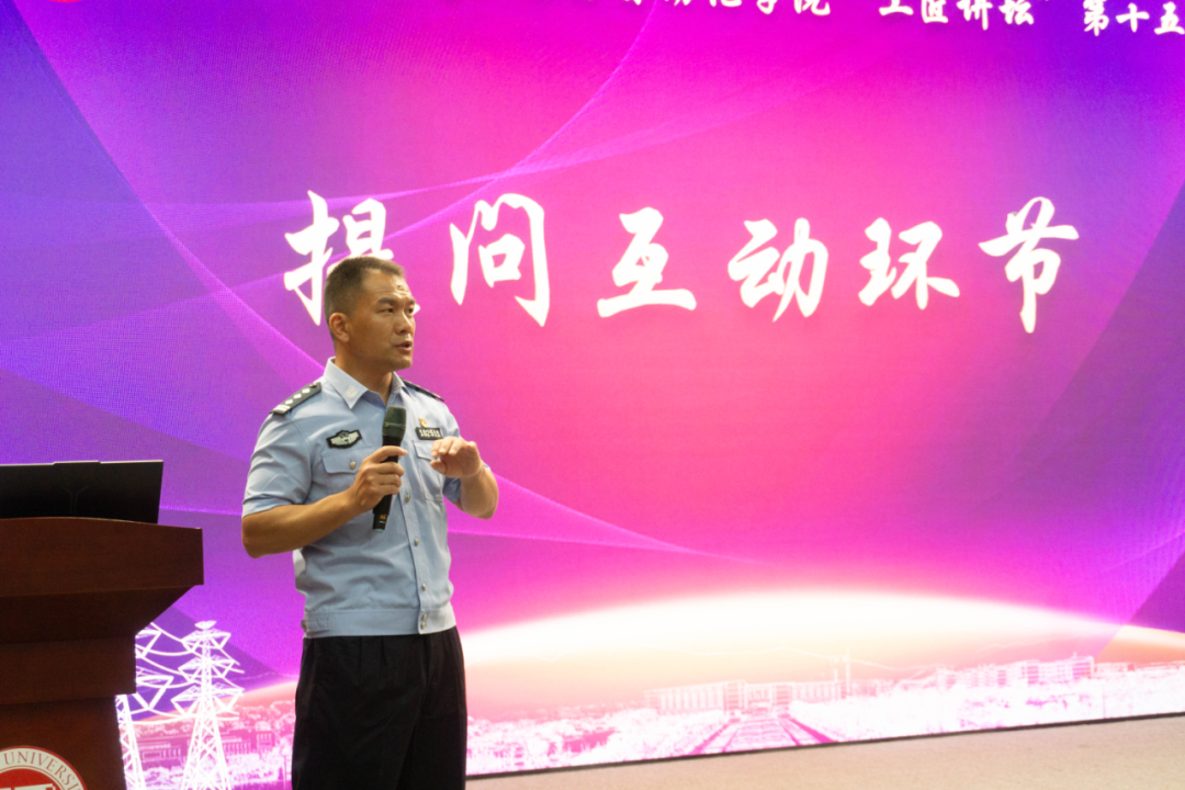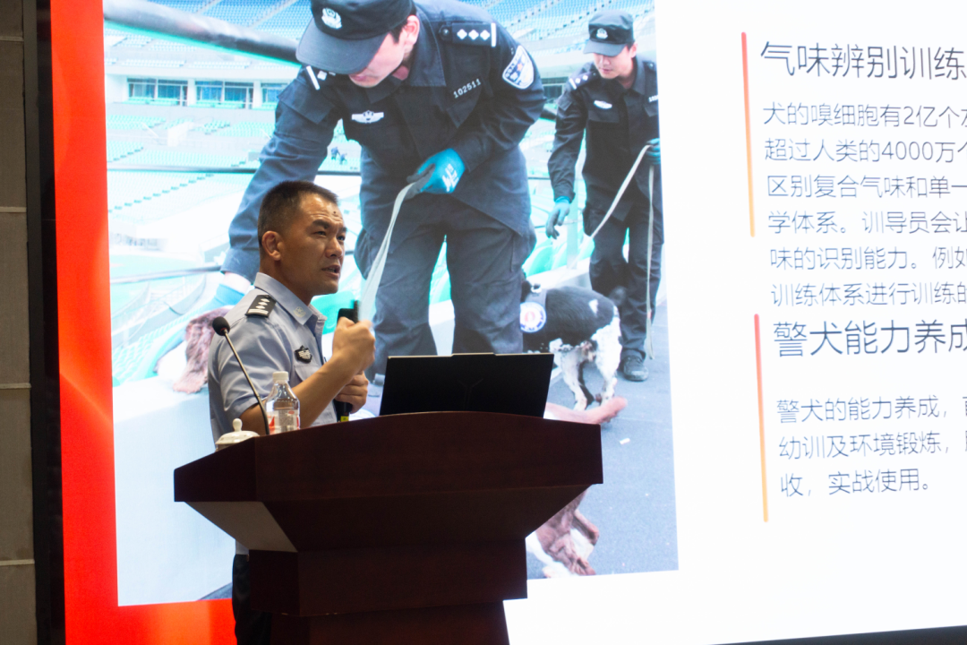 另一位同学提出:警犬训导过程中会存在大量电气设备,怎么避免电气设备对警犬来带的不良影响?何士涛教导员回答道:我们要让警犬适应。我们要把警犬驯服,这才能体现出警犬为公安工作服务的本质要求。