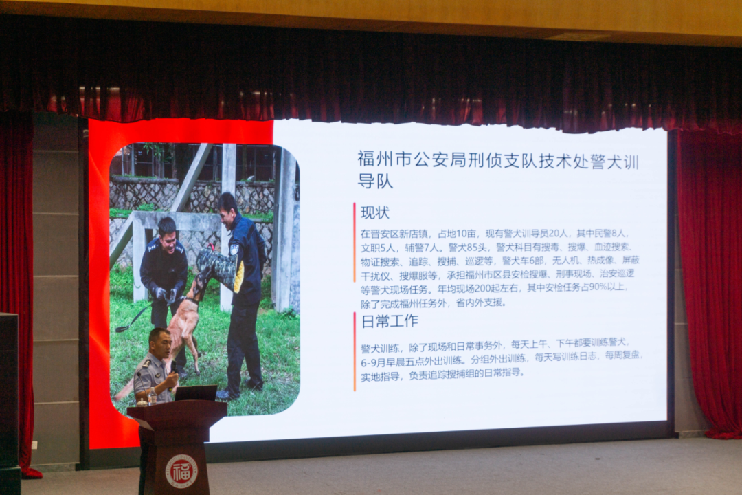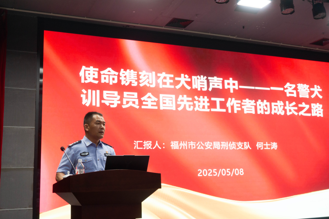 随后,何士涛教导员分享了他作为全国先进工作者的成长密码。他用一条条绶带背后的故事,诠释了警犬技术的钻研与管理水平的提升。他把传承当作使命,构建了新生代训导员培养矩阵,致力于警犬文化的公众传播。在他的荣誉墙上,镌刻着团队的基因,也见证了他的个人成长之路:从 2018 年荣获首届“我最喜爱的福州警星”,到 2025 年荣获全国先进工作者,每一步都坚实而荣耀。