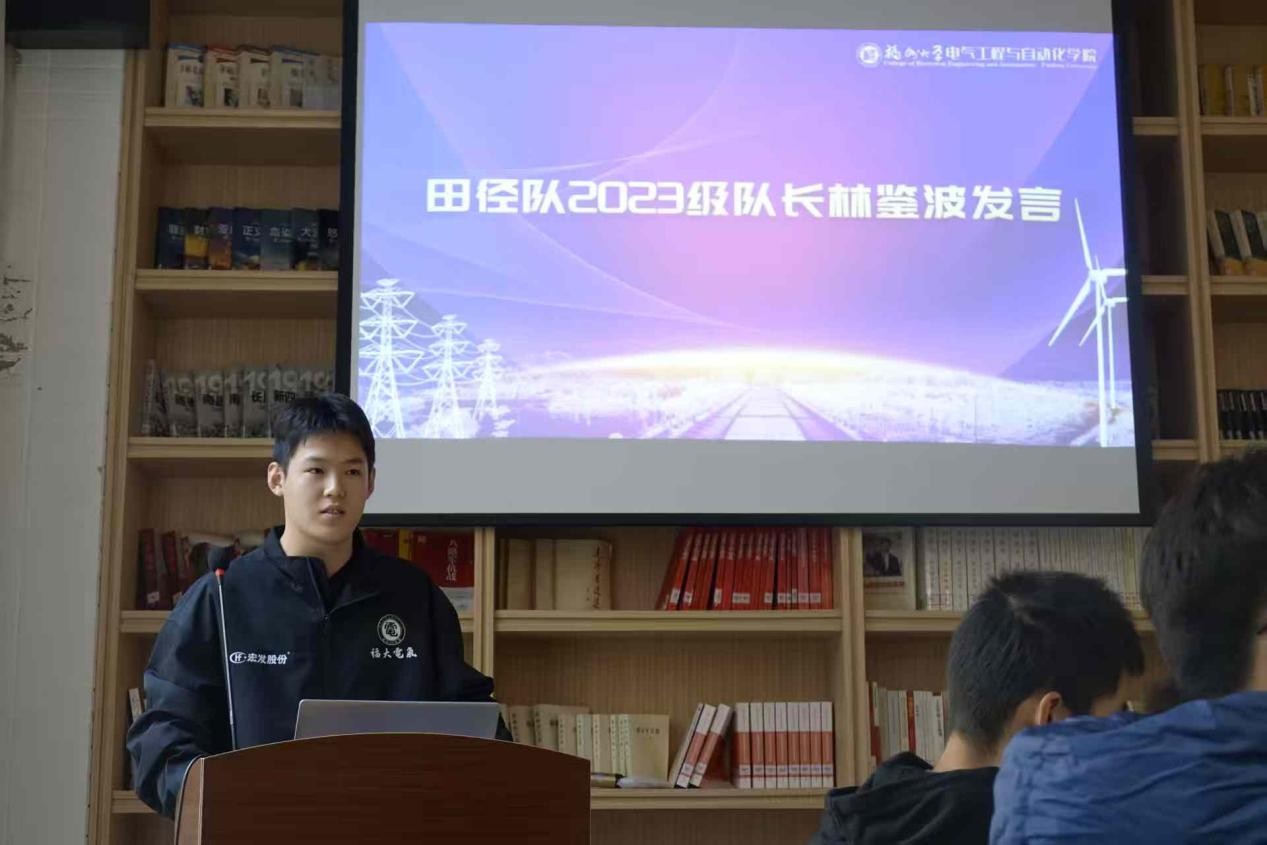 随后,田径队2024级队长王豪福汇报了本届校运会的得分情况,清晰地展现了团队在各项目中的诸多成果:在本届校运会中,我院健儿们勇夺学生团体总分亚军、男学甲亚军和女学甲季军,获得体育道德风尚奖“振奋杯”团体总分第三名;女子4×400米接力、男子跳远、女子跳远等项目均夺得甲组第一名,而在女子五项全能的比赛中,魏雨婷同学更是以2351分的成绩创造校纪录,以突破自我的执着诠释电气底色。电气学子们所展现出的卓越素质,正是对我院“无体育,不电气”的竞技精神的继承与发扬。