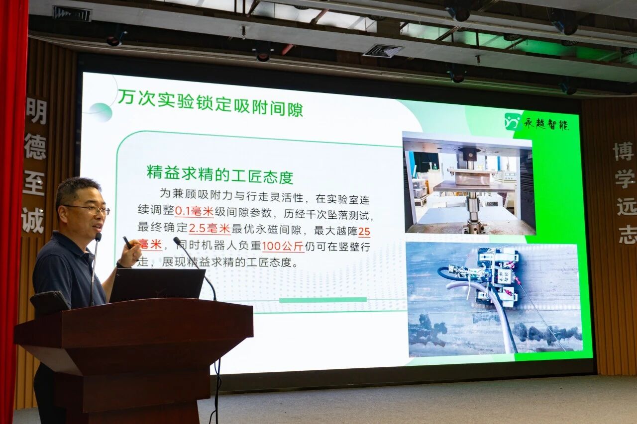沈顺喜长期从事特种机器人与工业自动化研发,主持多项省级课题,主导设计磁吸式爬壁机器人、北京冬奥会氢制冷系统核心部件,牵头制定多项团体标准。讲座中,他以“缘—攻坚·突破·落地—启示”为主线,讲述团队针对修船行业高空高危、粉尘污染、人工成本高等痛点,历经千次测试将永磁间隙优化至2.5毫米,实现60°曲面稳定吸附、作业效率50平方米/小时。该“福建首创、国内领先”成果已应用于中船、福船等企业,实现零安全事故与零环境污染。他强调工匠精神在于长期坚守与精益求精,鼓励学子深耕专业,以匠心推动地域品牌走向全国。