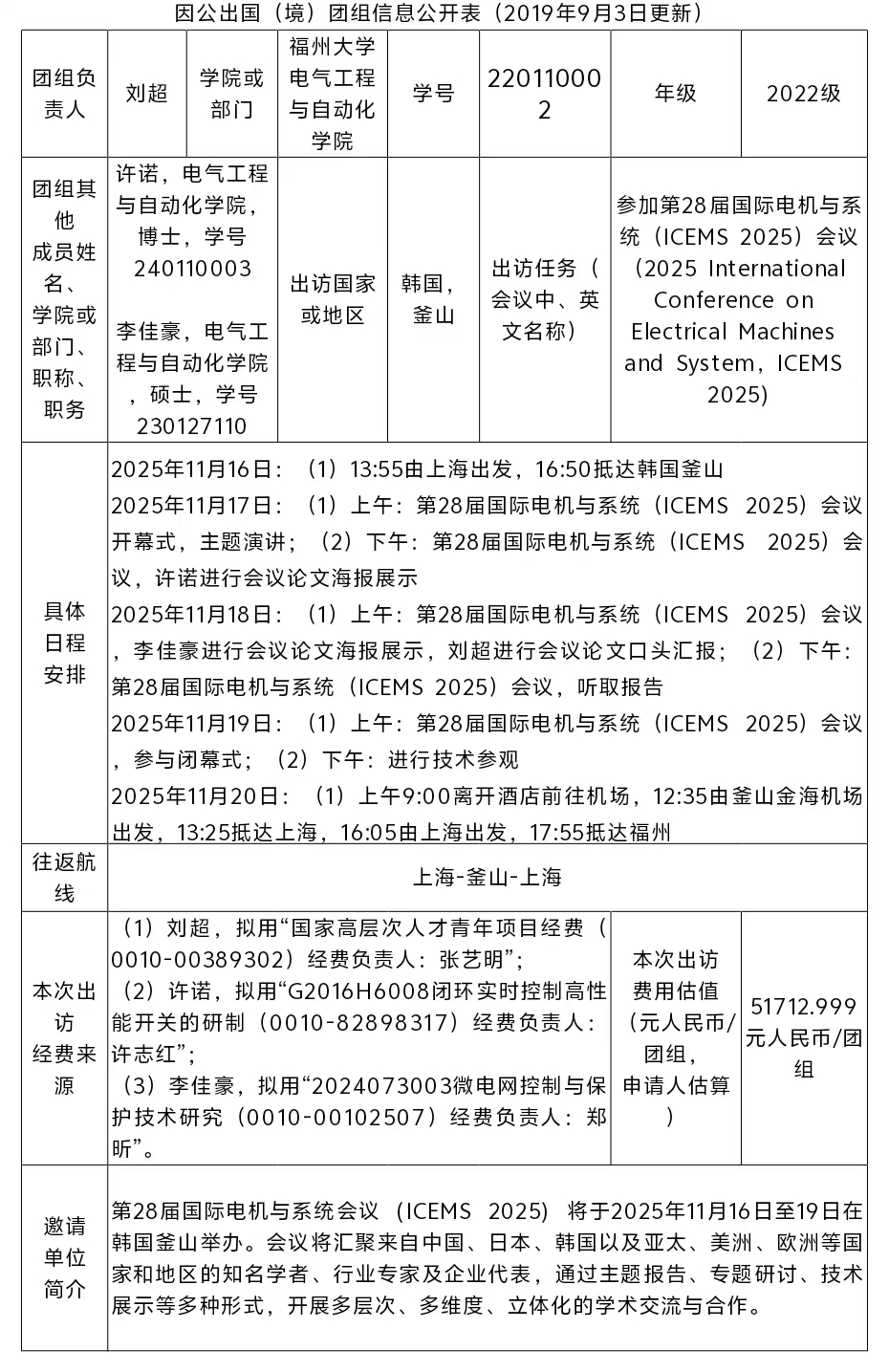 拟派刘超博士生、许诺博士生、李佳豪硕士生于2025年11月赴韩国釜山参加第28届国际电机与系统(ICEMS 2025)会议(2025 International Conference on Electrical Machines and System),现予以公示。公示时间从2025年10月29日起算,公示期为五个工作日。如有异议,敬请监督。联系电话:0591-22866584。