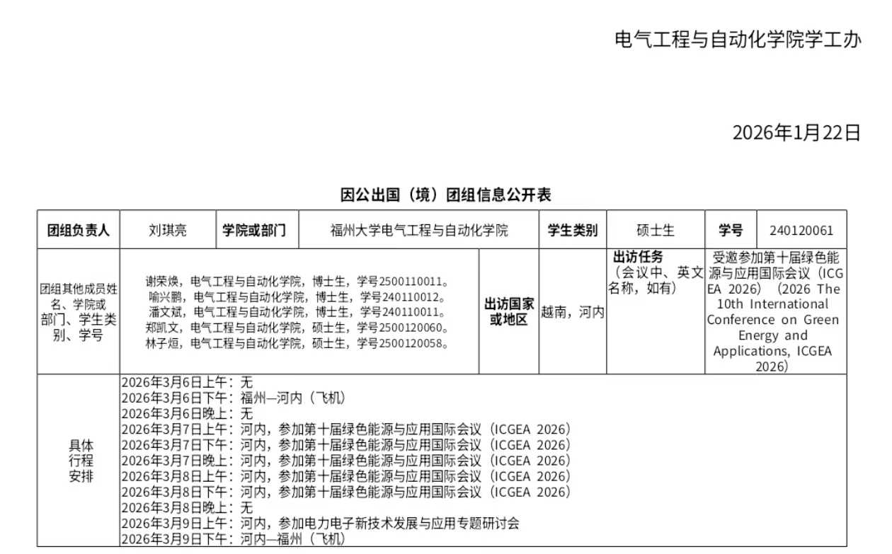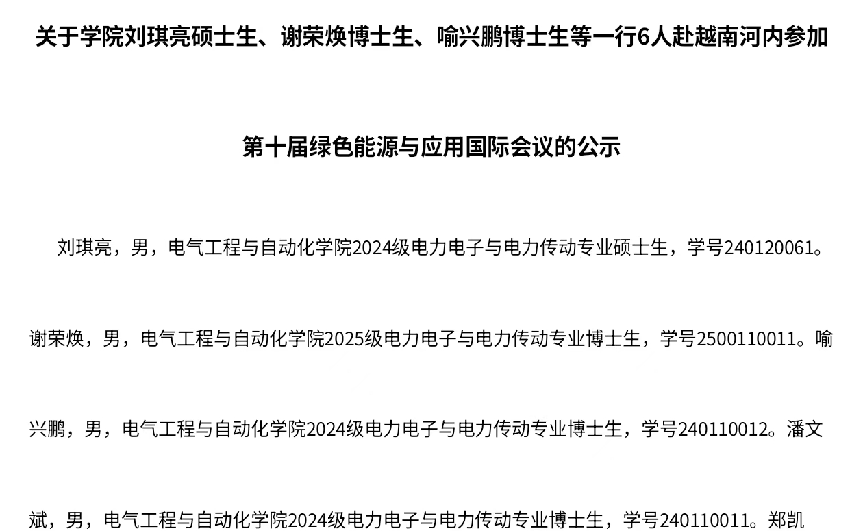 关于十三水算法 刘琪亮硕士生、谢荣焕博士生、喻兴鹏博士生等一行6人赴越南河内参加第十届绿色能源与应用国际会议的公示