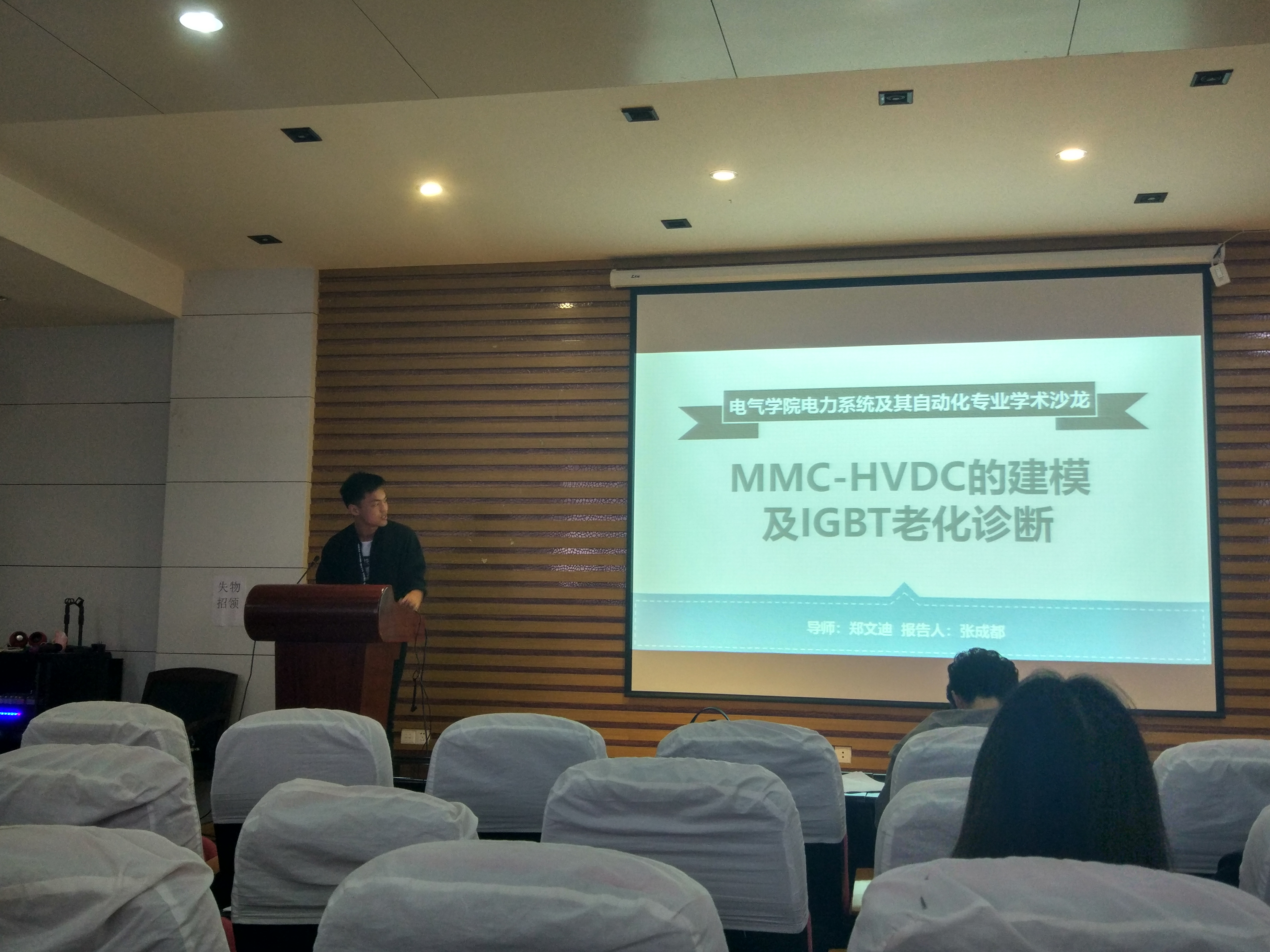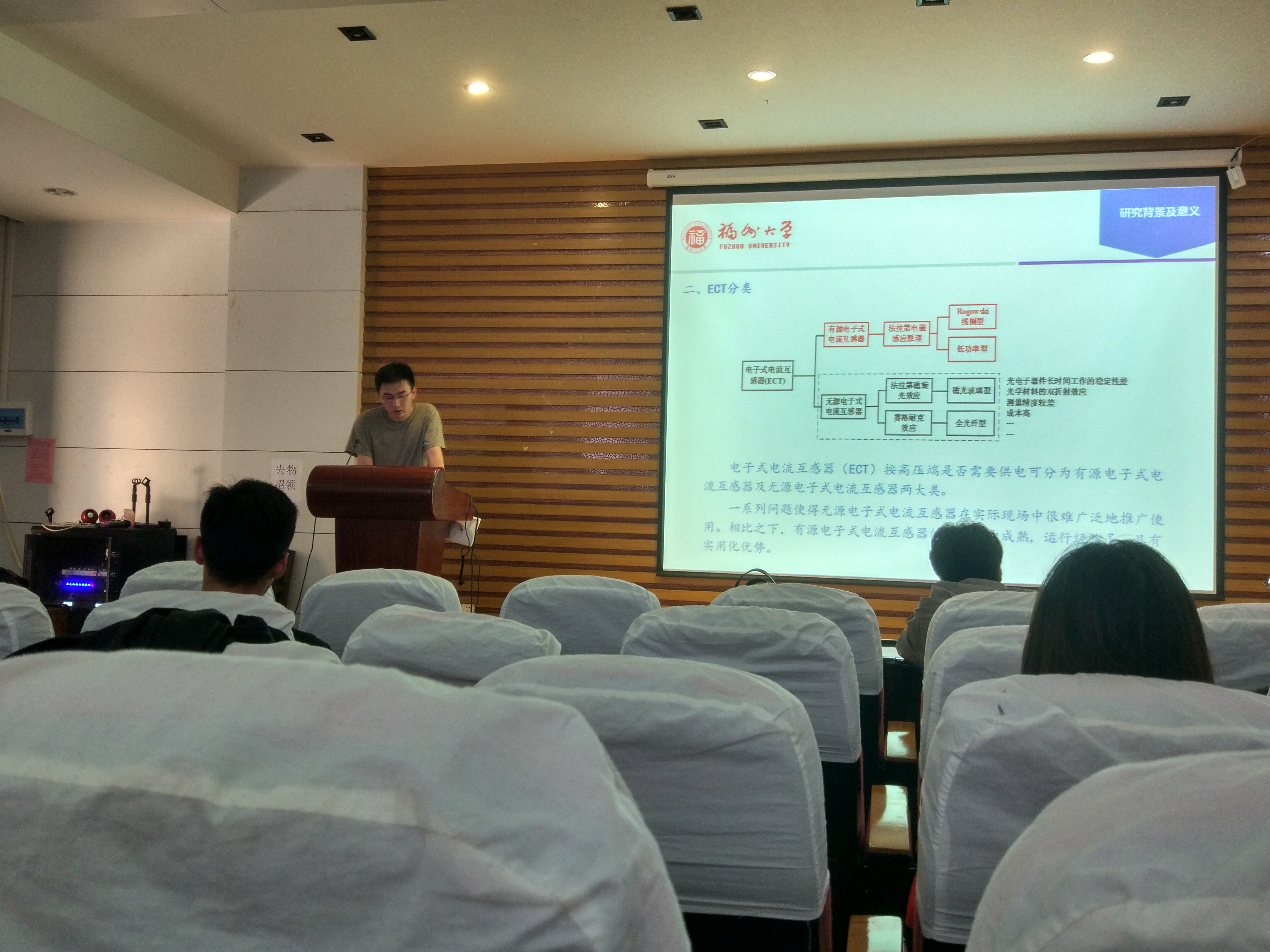 主持人简单开场过后,报告会开始。本次报告会的顺序依次是陈昊同学的《自取能电子式电流互感器研究与设计》、苏贤同学的《一种线性测量的光学电压传感器》、邵翔同学的《配电网单相接地故障区段智能定位方法研究》、陈少伟同学的《基于EM参数辨识算法的谐波源定位》、张成都同学的《MMC-HVDC的建模及IGBT老化诊断》、林晓宁同学的《基于粗糙集理论的变压器绝缘状态评估方法的研究》、以及黄宗龙同学的《基于双层规划的DG及电动汽车充电站优化配置》。